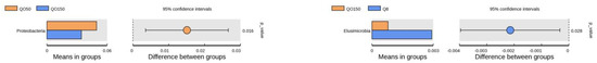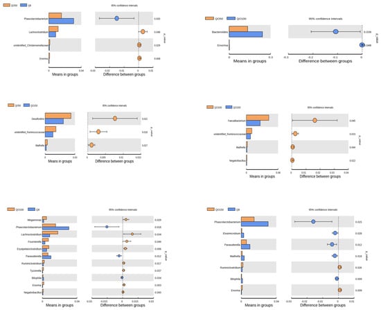 At the phylum level (Figure 4), the number of Proteobacteria in the QO50 group was significantly higher than that in the QO150 group (p = 0.016), and the number of Elusimicrobia in the Q8 group was significantly higher than that in the QO150 group (p = 0.028). At the genus level (Figure 5), comparing the Q8 group with the QO50 group, the number of Phascolarctobacterium in the Q8 group was significantly higher than that in the QO50 group, while the numbers of Lachnoclostridium, unidentified_Christensenellaceae and Enorma in the QO50 group were significantly higher than those in the Q8 group (p < 0.05). Comparing the QO50 group with the QO100 group, the number ofs Bacteroides and Enorma in the QO50 group were significantly higher than those in the QO100 group (p < 0.05). The numbers of Desulfovibrio, unidentified_Ruminococcaceae and Mailhella in the QO50 group were significantly higher than in the QO150 group, as determined by a T test. Comparing the Q8 group with the QO100 group, the numbers of Megamonas, Lachnoclostridium, Fournierella, Erysipelatoclostridium, Ruminiclostridium, Tyzzerella, Enorma, and Negativibacillus in the QO100 group were significantly higher than those in the Q8 group, while the numbers of Phascolarctobacterium, Parasutterella and Bilophila in the QO100 group were significantly lower than those in the Q8 group (p < 0.05). Comparing the QO100 group with the QO150 group, the numbers of Faecalibacterium, unidentified_Ruminococcaceae, Mailhella and Negativibacillus in the QO100 group were significantly higher than those in the QO150 group (p < 0.05). Comparing the Q8 group with the QO150 group, the numbers of Phascolarctobacterium, Elusimicrobium, Parasutterella, Mailhella and Bilophila in the Q8 group were significantly higher than those in the QO150 group. The numbers of Ruminiclostridium and Enorma in the Q8 groups were significantly lower than those in the QO150 group (p < 0.05).