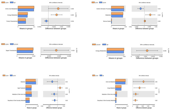 We used software to predict the abundance of functional genes with significant differences in the L2 level of the KEGG pathway (n = 6/group), and thus analyze the functional differences between the two groups. The analysis’ results are shown in Figure 6. Comparing the Q8 group with the QO50 group, Amino Acid Metabolism and Energy Metabolism were significantly enriched in the QO50 group (p < 0.05). Poorly Characterized was significantly enriched in the Q8 group (p = 0.034). Comparing the QO50 group with the QO100 group, Genetic Information Processing was significantly enriched in the QO100 group (p = 0.014). Metabolism and nervous system were significantly enriched in the QO50 group (p < 0.05). Comparing the Q50 group with the QO150 group, Signal Transduction was significantly enriched in the QO50 group (p = 0.019). Comparing the QO100 group with the Q8 group, Energy Metabolism was significantly enriched in the QO100 group (p = 0.008). Comparing the QO100 group with the QO150 group, Metabolism, Metabolism of Other Amino Acids, and Biosynthesis of Other Secondary metabolites were significantly enriched in the QO150 group (p < 0.05), while Signal Transduction was the opposite (p = 0.036). Comparing the QO100 group with the QO150 group, Amino Acid Metabolism, Energy Metabolism, Metabolism of Other Amino Acids and Biosynthesis of Other Secondary metabolites were significantly enriched in the QO150 group (p < 0.05).