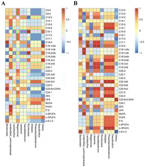 Spearman correlation analysis between cecal microbes and muscle fatty acids at genus level. Notes: (A) Correlation analysis between pectoral fatty acids and cecum microbes; (B) Correlation analysis between leg muscle fatty acids and cecum microbes. ** p < 0.01; NA No correlation.