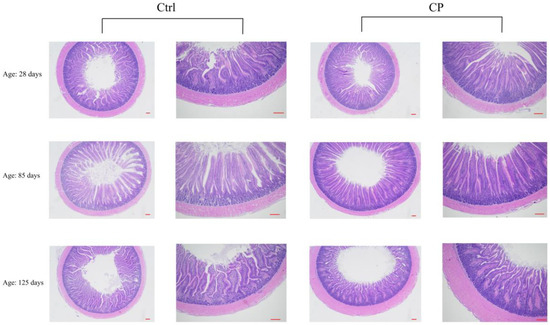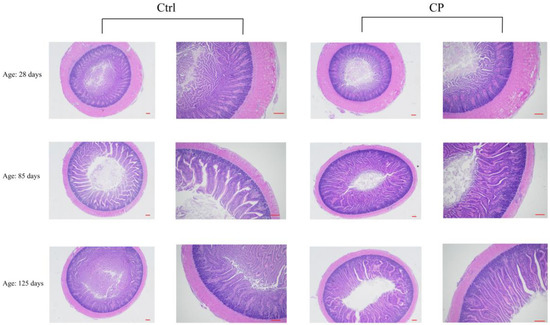 At days 85 and 125, the VH in the jejunum of the CP group was significantly higher (p < 0.05) than those of the Ctrl group (Table 7, Figure 2). However, there was no significant difference (p > 0.05) in the CD and the VH/CD ratio between the CP and the Ctrl groups.