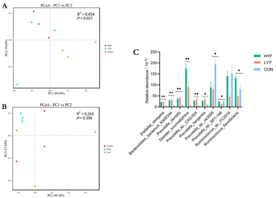 | Mitsuokella | 17.65 b | 5.72 c | 42.14 a | 1.19 | <0.01 |