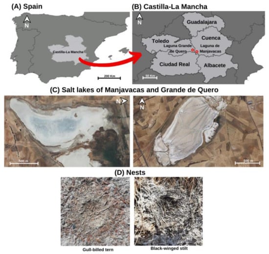 Maps showing the selected study area where the nests of the wetland colonial birds were examined to find plastic debris. (A) Castilla-La Mancha, located in Central Spain; (B) the two studied salt lakes (Manjavacas and Grande de Quero) located in Cuenca and Toledo; (C) aerial view of the studied salt lakes; (D) nest details of the two studied species.