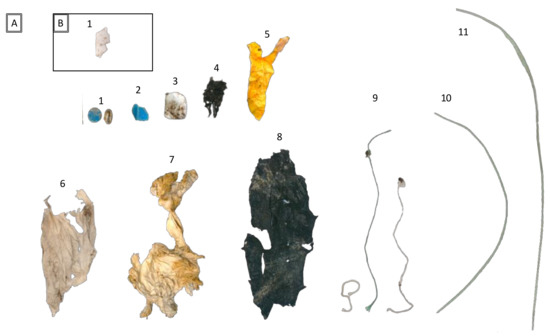 Anthropogenic debris collected in the gull-billed tern (Gelochelidon nilotica) nests from two breeding colonies (A,B) in the La Mancha Húmeda Biosphere Reserve. Each number corresponds to a different nest. Additional information about each item is provided in Table 1.