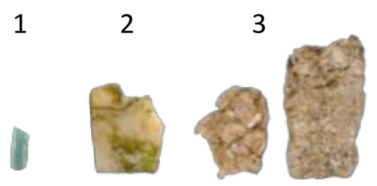 Anthropogenic debris collected in three nests of the black-winged stilt (Himantopus himantopus) located in the La Mancha Húmeda Biosphere Reserve. Each number corresponds to a different nest. Additional information about each item is provided in Table 1.