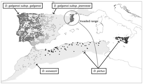 Native-range data for D. pictus included 76 occurrences from Algeria and Tunisia (presence-only data: [29] and unpublished data from P. geniez) and 115 occurrences from Sicily (among 373 10 × 10 km atlas cells: [30]). Northern African data also provided 113 occurrences for D. scovazzi from Morocco (presence-only data: [31] and unpublished data from P. geniez) (Figure 1).
