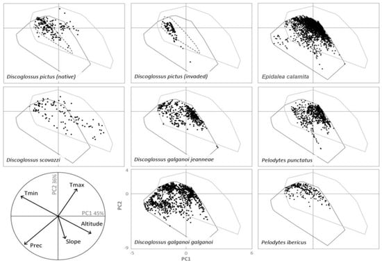 The main two axes of the PCA accounted for 81% of the total variance: PC1 (45% of variance) was negatively correlated with minimum temperature and precipitation (r = −0.58 and r = −0.53, respectively) and positively correlated with altitude (r = 0.52); PC2 (36%) was positively correlated with maximum temperature (r = 0. 51) and negatively correlated with precipitation and slope (r = −0.47 and r = −0.43, respectively). Comparisons of the environmental ranges of Discoglossus congeneric species indicated that the environmental conditions in their native ranges were quite similar (Figure 2), suggesting that congeneric species could easily occupy broader extensions without the existence of biotic interactions. A similar situation was found when comparing the native and invaded ranges of D. pictus, with an invaded range that seemed to be a smaller subset of the conditions occupied in the native range. After plotting the occurrences of D. pictus in a bivariate plot of the first two factors, only four occurrences (3.3% of occurrences) from the invaded range were outside the native environmental space, showing little niche shifting to new environmental conditions from the invaded area (Figure 2). Non-congeneric native species also showed a strong niche overlap with D. pictus, with more than 80% of each species’ environmental space intersecting with the D. pictus environmental space within the invaded range.