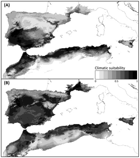 Current (A) and future (B) climatic suitability predictions for Discoglossus pictus in northern Africa and southern Europe. Future climatic predictions are based on the optimistic greenhouse gas scenario (RCP 2.6).