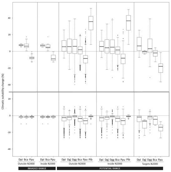Species climatic suitability change (%) under optimistic (upper) and pessimistic (bottom) climate warming scenarios, different D. pictus ranges (invaded or potential), and protection regimes, splitting areas inside and outside Natura 2000 (N2000) from those Natura 2000 sites where species are explicitly targeted (Targets N2000). Dpi, Discoglossus pictus; Dgj, Discoglossus galganoi jeanneae; Dgg, Discoglossus galganoi galganoi; Bca, Epidalea calamita; Ppu, Pelodytes punctatus; Pib, Pelodytes ibericus. Points show outliers; lower and upper whiskers indicate the 5% and 95% percentiles, respectively; lower and upper hinges indicate the 25% and 75% quartiles, respectively; and the central black line indicates the median value.