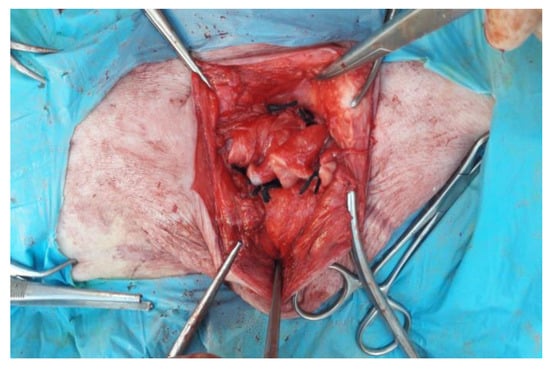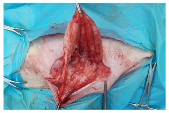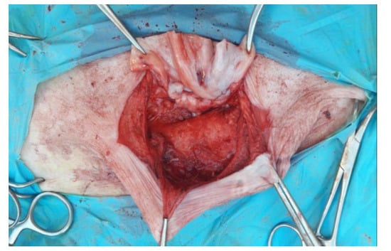 The animals were all subjected to general antibiotic therapy with broad-spectrum drugs by administering Amoxicillin (Betamox LA, 150 mg/mL, Vétoquinol, Bertinoro, Italy), at a dosage of 1 mL/10 kg by deep intramuscular route, for 3–5 days; the wound was medicated immediately after surgery and treated with an antibiotic spray (Terramicina Spray, Zoetis, Roma, Italy), applied twice a day for 5 days.