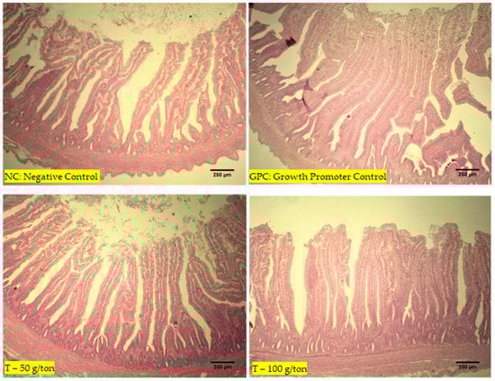 The highest villus height was observed in the T-100 group compared to the chickens in the GPC and NC groups (p < 0.001). Greater crypt depths were found in the T-100 group than in the CP (p < 0.001). Higher villus/crypt ratios were observed in T-100 and 50 groups than in the GPC and NC groups, while the GPC group exhibited ratios superior to those in the NC group (p < 0.001; Table 4). No lesions or changes were observed in the intestines (Figure 2).