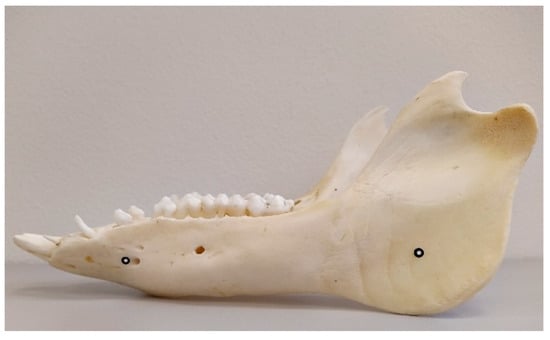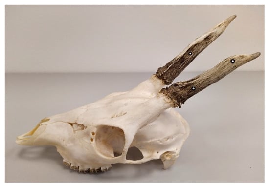 For both types of objects—mandibles and skulls with antlers—reference points of 1.5 mm were used (Table 1). Four reference points were placed on the mandible: two on each side of the mandible, one in the mental foramen (foramen mentale), and the other in the area of the angle (angulus mandibulae) (Figure 1). In the case of deer skulls with antlers, six reference points were placed symmetrically on each side. Their position was specified in relation to the articulation of the antlers. Two points were placed on the outer surface of the antler, one at the bottom, one at the top, and one point was placed on the inside of the antler (Figure 2). The reference points were also placed evenly on the turntable.