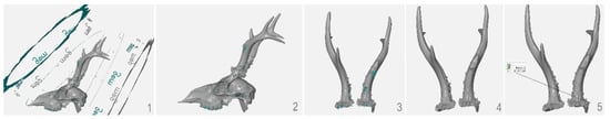 The object was inspected using the GOM Inspect 2019 program, version 2.0.1. The primary functions of the software include the editing of a polygonal network, importing of the cloud of points and polygonal networks, sealing holes in the polygonal network by interpolation of the surrounding surface, smoothing, reducing, and thickening of a polygonal network, and triangle regularization. Basic modification of the object was based on removing randomly scanned elements from the vicinity of the object. In the creation of the antler mesh object, the antlers were first cut from the skull, and all residue of the antlers on the skull were removed, including the pedicles. In the case of a missing polygonal network, the openings were filled in so as not to disturb the natural shape of a part of the object and to prevent inaccuracies in the measurements (Table 2). Scanning was carried out in such a way as to avoid unnecessary hole formation. In the case of complex objects, it is not possible to completely prevent the formation of holes, but only to keep it to the necessary minimum by taking more images of the object in more positions. The object was scanned so that the maximum size of the unscanned area did not exceed 5 mm. Within this space, there were few holes predominately on the underside of the antler, sitting on the skull where it is not possible to scan the object (Figure 3). The dimensions measured on the mandible were chosen, from the previous experience, that best represent the development of the subject and reflect possible sexual dimorphism (Figure 4).