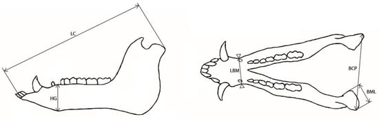 Dimensions measured on the mandible. Notes: LC—length of the cranium (condylobasal length), from the front part of pars incisive to anterior-most point of the processus condylaris; HG—height of the mandible, from the bottom of the symphysis mandibulae to the top of the margo interalveolaris; LBM—minimum breadth of the mandible; BCP—breadth of the mandible, between the borders of the medial and lateral points of the caput mandibulae; BML—breadth of the caput mandibulae.