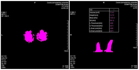 The creation of the scanning protocol was inspired by the human default protocol for a child’s head, with only slightly adjusted exposure parameters—added mAs (milliampere-second) compared to the topogram-controlled CARE dose 4D (a specific system for current modulation of radiation, which is used to reduce the radiation load) automatic system, which is able to add mAs in larger areas for a better image quality because of temporal resolution while reducing the radiation dose in areas where intense “radiation” is not needed. The effective value of 180 mAs was never exceeded for a deer skull. For scanning and reconstruction parameters, the following parameters were the most important for the research: an “acquisition” section thickness of 2.0 mm (tolerance ± 0.5 mm) and a reconstruction section of 1.0 mm (tolerance ± 50%). The collimation of the detectors was 16 × 0.6 mm, i.e., the lowest possible and the recon increment was 0.5 mm. The kernel selected was U90 ultrasharp to enhance the density interfaces, i.e., the accuracy of the edges and contours to increase the accuracy of the measurement. For the virtual reconstruction, the Syngo CT VC40 program was used. A standard bone window was selected, which sufficiently displays both the antlers and the teeth in our case. The bone window is clearly defined with brightness and contrast. The width of the window was 3000 HU (Hounsfield units), and the window center was 400 HU. The acquisition FoV 1 corresponded to the whole object, i.e., the skull including antlers, with the FoV2 corresponding to the second reconstruction carefully defined only in the center of the coronets—as close as possible to the perpendicular line to the axis of their growth up to the entire antler. A pitch compromise of 1.0 between speed and image quality proved to be a very suitable solution (Table 3). From the acquisition, an MPR was created—a multiplanar reconstruction and a measured object in a bone window using the “volume rendering” technique, i.e., VRT. The measurements were performed in a bone window and on an aligned anatomical plane, always accounting for the one that needed to be measured, i.e., correlated with the same section. The measurements of antler volumes were performed in the Volume SW Siemens Syngo application, and they were considerably simplified by the previous methodology of creating the 2nd reconstruction and the selected FoV, when a part of the skull was already cut off, and only the volume of the antlers was measured (Figure 5).