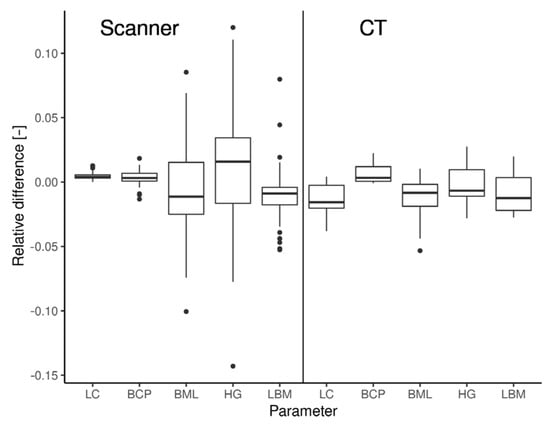 In the case of the LC parameter, a significantly positive deviation of the scanner measurement from the primary measurement was observed. This contrasts with the results from the CT method, where a significant negative deviation was observed for this parameter (the CT method, which significantly underestimated the length of this parameter). For the BML and HG parameters, no significant deviations were found in either case. The LBM parameter was significantly underestimated in the case of scanner measurements; no significant deviation was observed in the case of CT measurements (Table 4).