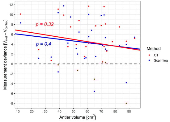 Analysis of the dependence of deviations in the measurement of antler volume using the tested methods on the actual antler volume showed an insignificant trend (CT, p = 0.317; 3D scanner, p = 0.405) for the scanner and CT measurement method. In our experiment, both technologies slightly overestimate the volume of the antlers, independent of their actual volume. For the measurements derived from the CT scan, the average deviation from the reference measurement is 4.49 cm3 (95% confidence interval 2.77–6.209). The data from the 3D scanner shows a positive deviation of an average of 4.293 cm3 (95% confidence interval 2.738–5.847). The largest deviation was recorded for antlers with a smaller volume, with the deviation decreasing with increasing volume (Figure 7).