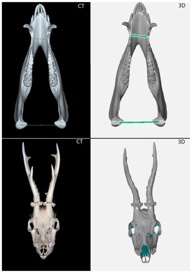 The basic technology applied in craniometry is the measurement of dimensions using a caliper [33]. Craniometric dimensions include the length and width of the skull, volume of the neurocranium, length of the nasal bones and palatine, the rows of teeth, the length, height and width of the mandible, antler dimensions, and other parts [34], for which modern technologies such as 3D and CT scanning could be used. Craniometric traits may indicate intraspecific differences between populations in different locations, the evolution of a species over time, or may be seen as an indicator of an individual’s physical condition or health development or development of separate subpopulations of wildlife [35,36,37,38,39,40,41,42,43,44,45,46,47,48].