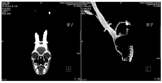Another important technology that can be used for craniometry purposes are CT scanners. Multidetector computed tomography (MDCT), or helical/spiral CT scanning, is now well-known [26]. MDCT represents the “third generation of CT devices”, which use helical CT scanning [27]. MDCT uses tomographs of various degrees of technical development, usually defined by the number of detectors (2–320) [28]. The use of standard “macroCT” devices is limited by insufficient knowledge of imaging limits for animal model species or by setting exposure parameters and CT protocols [29]. They are mostly used for large and exotic animals, which seem to be a suitable subject concerning the technical principles of CT, especially because of the volumetric similarity to humans [30]. The application in forensic or terminal ballistics, where the first attempts to set up and optimize protocols for the detection of missile fragments in cadavers can be seen, is still less frequent [31]. As part of optimization, basic craniometric measurements were performed when comparing dental protocols in selected species of dog carcasses [32].