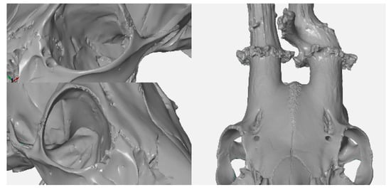 The mandible and the skull with antlers were scanned in two positions given the articulation of the object. Due to the high contrast between the skull and antlers, a chalk-based anti-reflective coating was used to scan the antlers. This spray unifies the color of the object, allows for faster and more accurate scanning, and is also easily removable. For more complicated objects, vaporizing anti-reflective spray can be applied. The automatic swivel pad ensures a constant scanning angle for each object. During scanning, automatic control of calibration, transformation, relative motion, and light change is performed with each image. For the antler scanning, 3–5 reference points located on the object were used to connect the measuring series. The resolution of the object scanned was recorded. After the conjunction of the measuring series, polygonization was performed at a standard level. The object was then exported. The output of the scanning is a digitized “mesh” object.