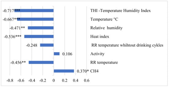 Correlation coefficients between THI, methane, and reticulorumen indicators. * p < 0.05, *** p < 0.001. CH4—methane; RR—reticulorumen.