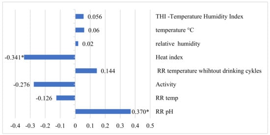 For the temperature–humidity index, we found a highly positive statistically significant relationship with temperature (r = 0.995, p < 0.001), a somewhat positive relationship with relative humidity (r = 0.598, p < 0.001) and a highly negative relationship with RR pH (r = −0.717, p < 0.001) (Figure 3).