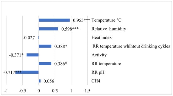 Methane was weakly negatively corelated with heat index (r = −0.341, p < 0.05), and weakly positively with RR pH (r = 0.370, p < 0.05) (Figure 2).