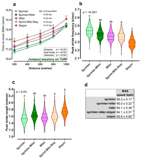Racehorse athletic careers generally only span a few years, during which racing opportunities can be limited []. Opting for a race distance that matches the individual horse’s characteristics and racing ability could markedly contribute to increasing its chance of winning. Therefore, trainers subjectively determine individual racehorse locomotory profile (sprinter, miler or stayer) early on in their training in order to ideally target the most appropriate exercise program and maximize their racing performance. Yet, a racehorse’s ability to gallop over five furlongs for a sprint race, as opposed to twenty for a stayer’s race, will differ significantly in terms of locomotion strategy. As they approach peak speeds, individual horses will either naturally increase their peak stride length or frequency. Over shorter distances, the requirements for acceleration and speed are pivotal, but as the distance increases, then efficiency of stride and stamina become more important. Stride length, rather than frequency is the main determining parameter to achieve higher maximal speeds []. During standard gallop training sessions, our results revealed clear locomotory differences: sprinters had shorter stride length of a higher frequency than stayers. It is conceivable that the effect of warm up, if different between sprinters and stayers (not to our knowledge) may have exerted some effect on these stride characteristics, as previously evidenced in showjumpers []. Fatigue can also cause racehorses to lose a stable stride frequency [], triggering a decrease in stride length []. We were unable to account for such aspects in our study, but in-field biomarking of fatigue through spot-sampling of blood could reveal important differences that could be trained in.