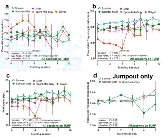 In further data, for 378 of the 421 horses where speed and locomotory information were available for pre-race ‘jumpout’ training sessions (n = 1013); that is, starting from a standing start in stalls, then the best time to cover any 200 m (furlong) from the first to the fifth furlong at 1000 m, then speed gradually became slower for all categories of horse, as expected, but was always significantly faster for retrospectively designated sprinters versus stayers (Figure 1a). In addition, peak stride frequency was higher (Figure 1b), stride length was shorter (Figure 1c) and peak recorded speed was higher (Figure 1d) in sprinters versus stayers. During the course of two racing seasons, we described whether locomotory parameters changed within individual racehorses of each category (sprinters to stayers; Figure 2). Whilst significant variability with individual training session from the first to tenth (relatively few horses completed ≥10, data censured at n = 10 training sessions) existed for peak stride length (Figure 2a) and peak speed (a slight increment; Figure 2c), the effect sizes were relatively small and not consistent, suggesting little evolution of locomotory parameters (i.e., no effect for peak stride frequency, Figure 2b,d).