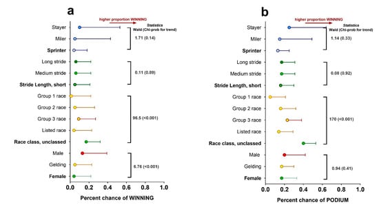 Racehorse success on the track results from a complex combination of genetics [], nutrition [] and training []. Such factors determine the expression of physical traits specific to the athletic demands of the sport. In Thoroughbreds, muscle strength, speed and endurance have been identified as traits that favour superior performance at various race distances []. In this study, colts (i.e., younger male horses not gelded) had higher odds of winning than geldings. This aligns with previous research which identified some of the non-genetic factors that affect racehorse performance: sex, age, class of race, track condition, handicap weight and distance [], and suggests that younger ‘entire’ male horses have the greatest chance of winning a race. Such an observation is also at odds with the fact that, in our dataset, the few stayers, who were older, had more race success. Perhaps the greater competition between horses in sprint races, the predominant race category in our dataset, is primarily won by colts as opposed to geldings. In stayer races, primarily competed in by older mares and geldings, and for obvious reasons very few entire males, then such differences are not apparent.