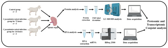 In recent years, with the reduction in the cost of and the improvement of technology, high-throughput sequencing has been fully applied in modern agricultural research, mainly in the fields of crop breeding, livestock and poultry disease diagnosis and livestock and the improvement in the poultry breeding guidance, etc., gradually showing its application advantages [8]. Aboshady identified variants in the GIN-sensitive or GIN-resistant creole goat genome by RNA seq, and the T-cell receptor signaling pathway was one of the most important pathways to distinguish the resistant from the susceptible genotypes, with 78% of the genes in this pathway showing a genomic variation. These genomic variants are expected to provide a useful resource for the molecular breeding of GIN resistance in goats [10]. Liu performed a comprehensive transcriptome and proteome analysis of goat skin at 45, 108 and 365 days of age, and found that the KRT and collagen α family proteins may play an important role in the development of the goat hair follicle and wool bending, providing a theoretical basis for revealing the molecular mechanism of goat wool bending [11]. Zhao also revealed that the main biological differences in the casheal fiber diameter differences in Tibetan casheal goats were attributed to intrinsic adaptations related to differences in the metabolism, hypoxia and stress response through the comprehensive study of transcriptome and proteome [12]. In this study, transcriptomics and proteomics were used to jointly analyze the spleen tissues of dairy goats infected with C. pseudotuberculosis at different time periods, mainly to clarify the mRNA and protein expression in the spleen tissues of dairy goats at different time periods after an infection with C. pseudotuberculosis. This paper attempts to explain the intrinsic relationship between the mRNA and protein expression, so as to provide theoretical basis for the molecular breeding of dairy goats.
