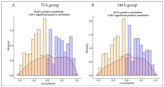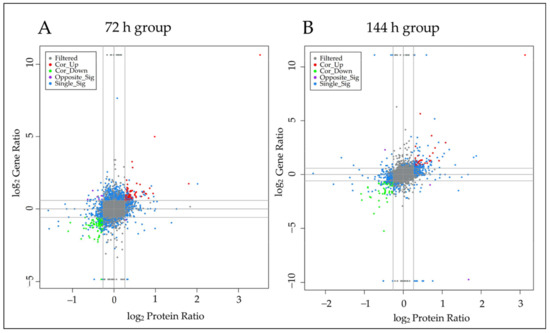 In this study, Spearman correlation analysis was performed on the obtained transcriptome and proteome data with the same trend, and it was found that 56.62% of the mRNA–protein pairs in the 72 h group had a positive correlation and 6.59% had a significant positive correlation (Table S4) (Figure 3A). in the 144 h group, 56.5% of the mRNA–protein pairs had a positive correlation and 4.38% had a significant positive correlation. Among the groups with an intersection at 72 h and 144 h, 97.5% of the 41 mRNA–protein pairs had a positive correlation and 45% had a significant positive correlation (Table S5) (Figure 3B).
