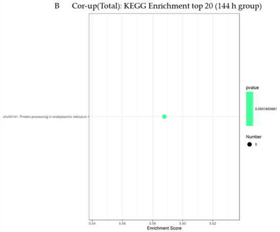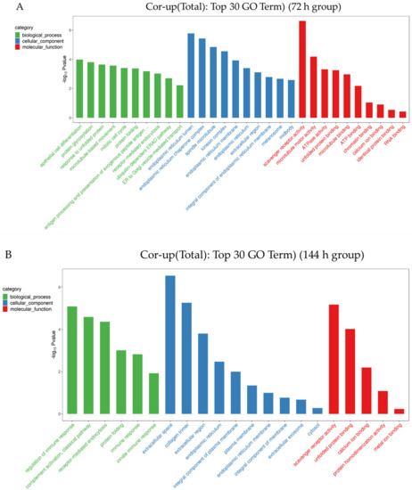 In this study, enrichment analysis was carried out for the co-up-regulated mRNA and protein genes in the 72 h group and the 144 h group. First, through GO (Gene Ontology) analysis (Figure 4), it was found that the top 30 terms selected in the 72 h group in this study are mainly enriched in an epithelial cell differentiation and protein glycosylation, and the response to it is mainly enriched in the biological process. The endoplasmic reticulum lumen, endoplasmic reticulum chaperone complex and spindle microtubule are in the cellular component, and the scavenger receptor activity, microtubule motor activity and ATPase activity are in the molecular function (Table S6). Within the 144 h group, the regulation of the immune response, complement activation, classical pathway and receptor-mediated endocytosis is in the biological process; the extracellular space, collagen trimer and extracellular region is in the cellular component; and the scavenger receptor activity, unfolded protein binding and calcium ion binding is in the molecular function (Table S7). At the same time, this study also found that both groups were highly enriched in the scavenger receptor activity, indicating that this function has been playing a key role.