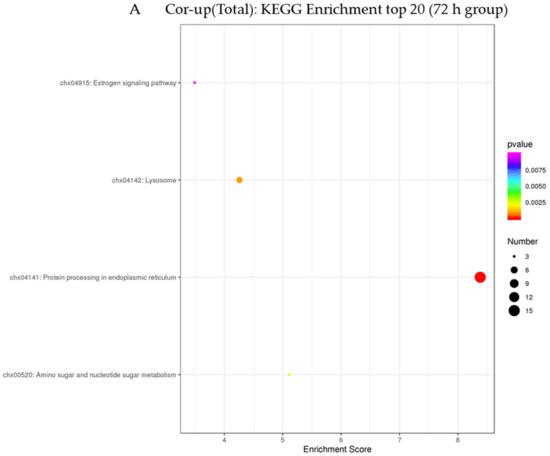 In this study, KEGG (the Kyoto Encyclopedia of Genes and Genomes) enrichment analysis was used to elucidate the signal transduction pathways mainly involved in the jointly upregulated mRNA–protein pairs (Figure 5). The results were as follows: in the 72 h infection group, four pathways were enriched by 18 co-upregulated mRNA–protein pairs. They were mainly enriched in the protein processing the endoplasmic reticulum, lysosome, amino sugar and nucleotide sugar metabolism and estrogen signaling pathway (Table S8). In the 144 h infection group, the protein processing in the endoplasmic reticulum pathway was enriched by mRNA–protein pairs which were co-upregulated by the five pairs (Table S9).