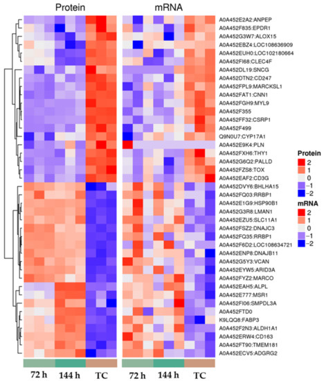 Unsupervised hierarchical clustering was performed on the expression levels of the corresponding genes/proteins in the two omics. Generally speaking, the same type of genes/proteins can appear in the same cluster, and the genes clustered in the same cluster may have similar biological functions. Then, when the intersection parts of the differential genes and differential proteins in the 72 h group and 144 h group were taken in this study, we found that there were 21 differentially expressed genes and the proteins were co-up-regulated and there were 20 differentially expressed genes and these proteins were co-down-regulated in both groups. It is clear from the heatmap (Figure 6) that the 41 gene–protein pairs were significantly different between the infected and control groups. Among them, 21 gene–protein pairs were highly expressed in the infection group and lowly expressed in the control group. The expression of 20 gene–protein pairs was low in the infected group and high in the control group. Among them, genes such as ALPL, FABP3, VCAN and SLC11A1 have been highly expressed at different times and ALOX15, SNCG, EPDR1 and CNN1 were all down-regulated compared with normal dairy goats.