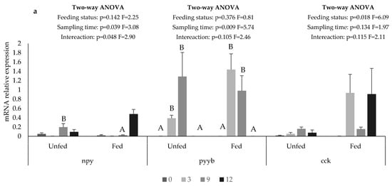 In the anterior intestine, npy expression at 9 h it was 9-fold higher in the unfed than in the fed group, while at 12 h npy expression, it was 5-fold higher in the fed group than the unfed group, although differences between groups were not statistically significant (Figure 4a). The expression of pyyb was not affected by the feeding status and was higher at 3 and 9 h than at the other sampling times (Figure 4a). In contrast, the cck expression was not affected by the sampling time but was higher in the fed than in the unfed group (Figure 4a).