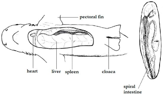 Basic internal anatomy of a carcharhinid shark (Carcharhinus melanopterus), showing the location of principal organs. Adapted from Crow and Brock [].