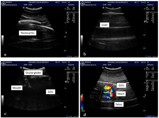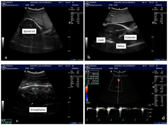 Upon ultrasound examination, it was possible to detail a fetus with a well-defined brain, tail, and pectoral and dorsal fins, with well-defined gills and coelomic cavity (Figure 1, Figure 2a–d, and Figure 3a–d). The fetal liver was characterized by a hypoechoic, homogeneous parenchyma with regular contours, also showing the gallbladder with anechogenic content (Figure 2b). The kidneys were partially defined and presented a slightly heterogeneous hypoechogenic parenchyma. The intestinal spiral with the characteristic spiral pattern was evident, as was a defined parietal stratification (Figure 3a). The cartilaginous skeleton was hyperechoic and formed a moderate posterior acoustic shadow artifact (Figure 3b). It was possible to detail the cranial conformation, define the orbital fossa housing the anechoic eyeball with a hyperechoic capsule (Figure 2c), and evaluate the biparietal diameter, which measured approximately 6.47 cm (Figure 3c).