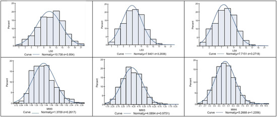 Histograms of the distribution of litter sizes (top: LS0, LS3, and LS4) and piglet weights (bottom: MW0, MW3, and MW4) from birth to 3 weeks or 4 weeks.