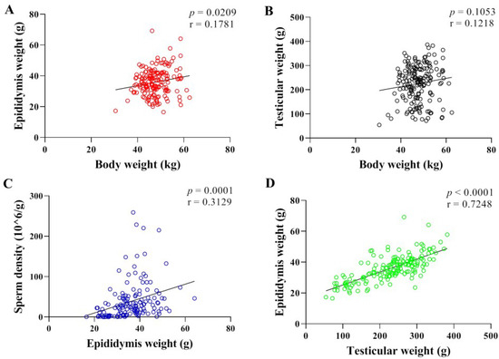 Correlation analysis between reproductive traits. (A): Body weight–epididymal weight (n = 168). (B): Body weight–testicular weight (n = 178). (C): Epididymal weight–sperm density (n = 145). (D): Testicular weight–epididymal weight (n = 168).