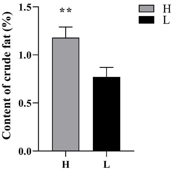 Crude fat content showed a significant positive correlation with sperm density (r = 0.28, p < 0.01) and epididymal weight (r = 0.20, p < 0.05). The crude fat content of group H was extremely significantly higher than that of group L (p < 0.01, Figure 2).