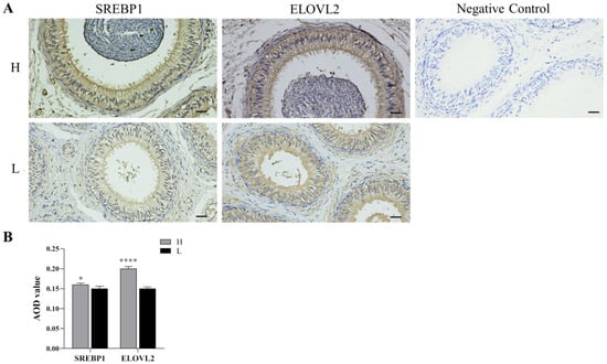 SREBP1 and ELOVL2 proteins were expressed in the pseudostratified columnar ciliated epithelium of the epididymal ducts as well as in the smooth muscle cells around the ducts, while only a small amount of expression was observed in the connective tissue between the epididymal ducts. The AOD values of SREBP1 and ELOVL2 in the pseudostratified columnar ciliated epithelium were significantly higher in group H than those in group L (p < 0.05, Figure 3).