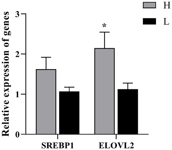 mRNA relative expression of SREBP1 and ELOVL2 in cauda epididymis of Hu sheep with different fertility. * indicates p < 0.05.