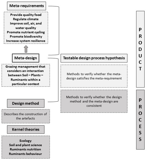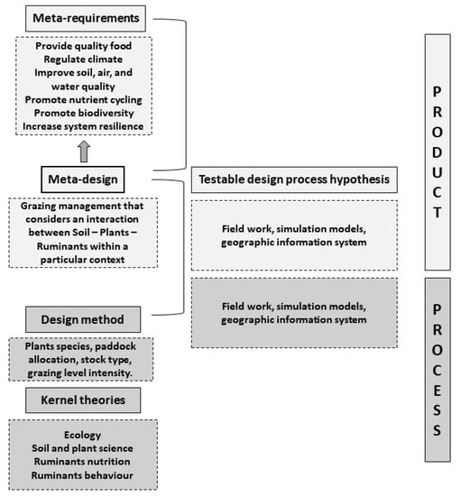 To apply the design theory concept to achieve alternative and more sustainable pastoral livestock production systems, we borrowed the theory of design according to Walls et al. (1992 [28]). Design theory is a prescriptive theory based on knowledge towards generating means, methods, and products to attain specific goals and face pre-defined problems. For example, pasture swards can be designed to provide ruminants a biochemically rich forage to enhance individuals and environmental performance [29,30]. Likewise, ruminants can be designed to produce healthy and high-quality products with less environmental impact and better nutrient use efficiency [31]. The design theory described by Walls et al. (1992 [28]) encompasses two features (Figure 1). The first one deals with the product, per se. It involves the construction of a framework depicting the meta-requirements (goals) that addresses a class of problems, the meta-design that describes the artefacts hypothesised to meet the meta-requirements, and the testable design process hypothesis that verify whether the meta-design satisfies the meta-requirement. The second feature deals with the design process; it addresses the design method that describes the construction of the artefacts, the kernel (fundamental) theories that govern the design process itself and the testable design process hypothesis that verifies whether the design method and the meta-design are consistent.