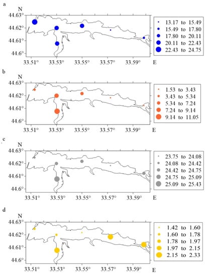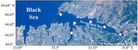 - Kuftarkova, E.A.; Rodionova, N.Y.; Gubanov, V.I.; Bobko, N.I. Hydrochemical characteristics of individual bays of the Sevastopol seashore. Works YugNIRO 2008, 46, 110–117. [Google Scholar]
