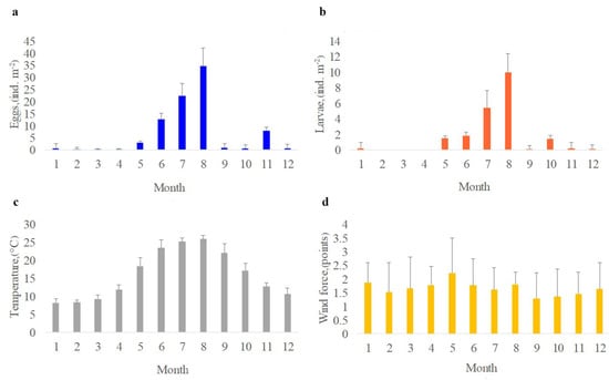 Intra-annual variability of the average values for the number of eggs (a), larvae (b), water temperature (c), the strength of the dominant north wind (d) with standard deviations in Sevastopol Bay in 2012–2021.