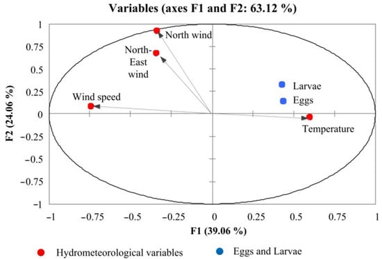 Correlation biplot diagram based on the principal component analysis (PCA) of the hydrometeorological variables and abundance of ichthyoplankton.