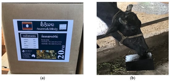 (a) MNB provided to farmers in Lao PDR; (b). buffalo cow consuming UMB10.