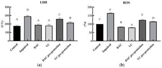 In addition, DAC pre-shielding capability was assessed by measuring the same indices mentioned above. It is clear from Figure 2 that DAC may protect the H2O2-induced damage to the GMEC antioxidant system in advance, and the effect is significant. Despite the higher LDH activity, relative ROS concentration, and MDA content in the DAC pre-protected group compared with the control group, they were also lower than those in the impaired group (p < 0.05). Conversely, with the exception of T-AOC, CAT, SOD, and GSH-Px, activities were greater than those in the control group, and were all greater than those in the impaired group (p < 0.05).