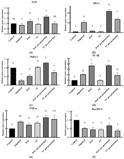 The integrity of the cell membrane system is maintained by VC, which can protect antioxidant enzymes within the cell, scavenge free radicals, and reduce lipid peroxidation and its products, thereby protecting the cell membrane from damage by oxidative stress [42]. Therefore, VC was selected as a positive control to explore DAC’s antioxidant mechanism laterally. According to the results, compared with the control and the impaired, the DAC pre-protected group can well reduce the relative content of ROS by improving the activities of CAT, SOD, and GSH-Px, thus reducing the generation of MDA, proving that DAC can perform the same role as VC to good effect. Interestingly, however, VC was not able to improve CAT activity, and the increase in SOD activity was much less than DAC. VC is known to be able to combine directly with hydrogen peroxide and its free radicals to perform an antioxidant role [43]; therefore, enhanced CAT activity is not required to degrade H2O2. Differentially, DAC may increase CAT transcription and expression by increasing Nrf2 expression [44], so DAC may improve CAT activity better than VC. But VC may still increase SOD and GSH-Px mRNA levels in mice [45] and can also positively regulate TRAIL expression in human breast cancer cells and activate Caspase [46]. It turns out that compared with the DAC pre-protection group, the VC pre-protection group did not show any change in the mRNA expression levels of TNF-α and Caspase-9, whereas expression levels of other genes were altered to varying degrees, indicating that the mechanism of VC pre-protection regulation was not the same as DAC.