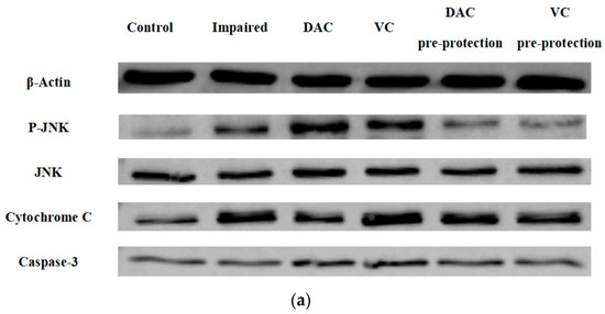 Due to the unexpected observations, subsequent protein expression was further investigated in this study. Figure 4 shows that JNK was more strongly phosphorylated in the impaired group (p < 0.05). Analogously, the expressions of Cytochrome-C and Caspase-3 are also increased (p < 0.05). This is in stark contrast to the findings of other studies, suggesting that DAC can affect GMEC in various ways. Original western blot figures and data are shown in Supplementary Materials Figures S1–S5 and Table S1.